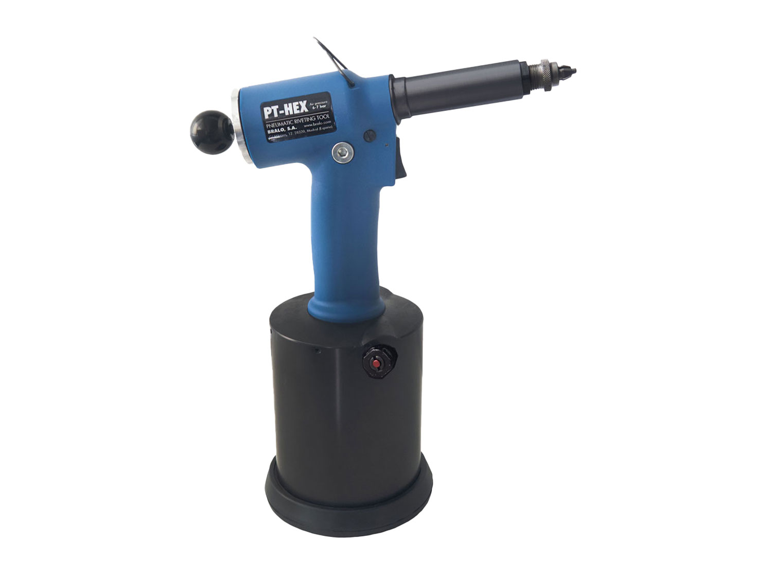 La remachadora neumática PT-HEX es una herramienta para la realizar agujeros hexagonales en diferentes materiales. Máquina robusta diseñada para complementar al operario en el proceso de remachado de tuercas